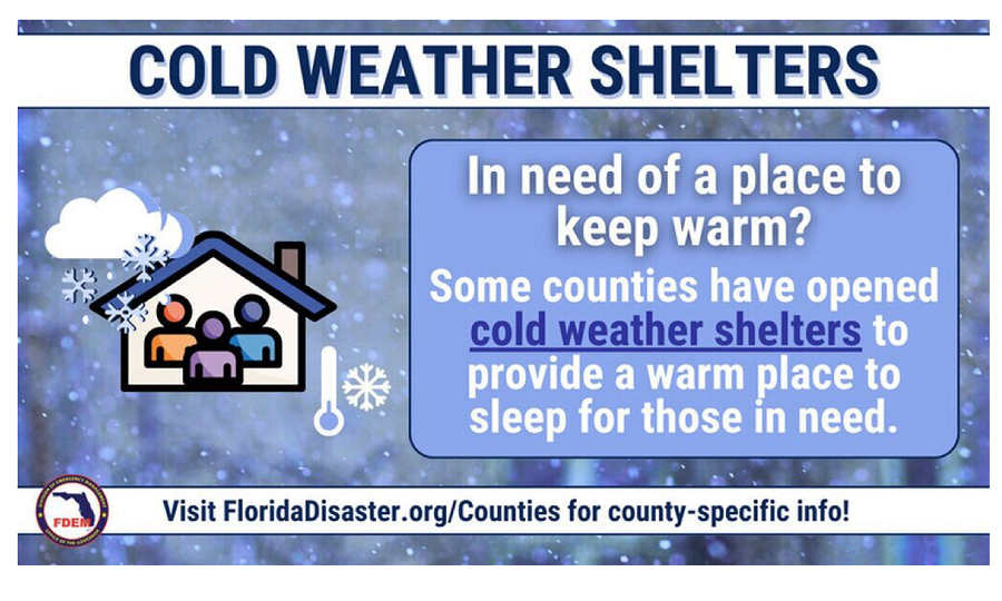 Please help share this info with anyone who might need a warm, safe place. For updates on shelters and cold weather tips, go to mymanatee.org/cold. For general county info, visit mymanatee.org or call (941) 748-4501. You can also follow @ManateeGov on Facebook, Twitter, and Instagram.