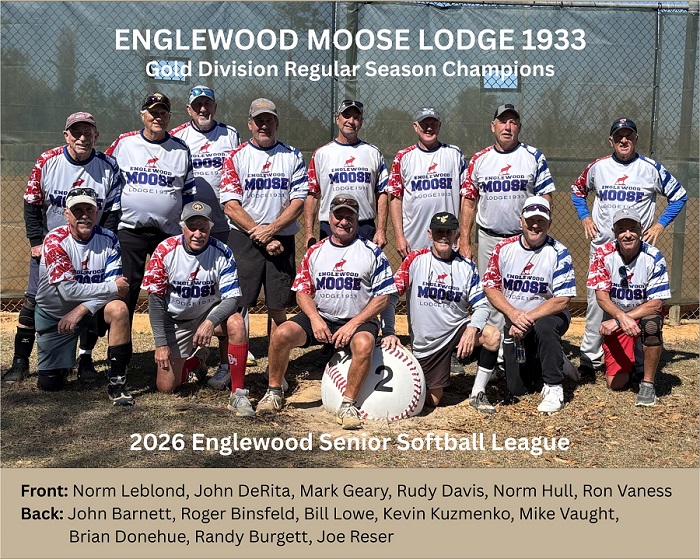 Englewood Moose Lodge No. 1933 won the Gold division for the second straight year and third time in four years with a 17 & 4 record. The team had 30 home runs to lead the league. “We had a large number of games missed by key players, but there is just no quit in this team,” said Mark Geary, manager of the Moose. “Repeating in the Gold division is very hard to do. But we have a solid, experienced team.”