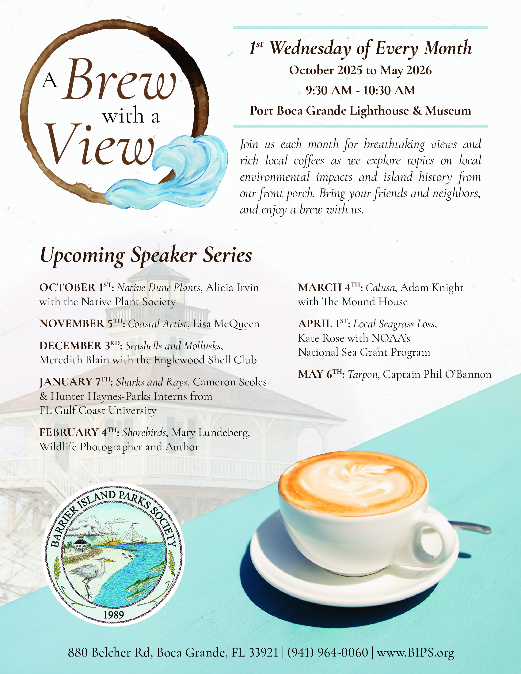 This brand-new monthly series invites the community to gather on the lighthouse front porch for an engaging morning of knowledge, connection, and coastal beauty during the monthly first-Wednesday Speaker Series from October 2025 to May 2026, 9:30am to 10:30am, featuring engaging talks on environmental topics and island history. Enjoy rich local coffee and stunning porch views while learning from experts including, Meredith Blain with the Englewood Shell Club on Seashells and Mollusks (December 3), Cameron Scoles and Hunter Haynes-Parks of Florida Gulf Coast University on Sharks and Rays (January 7), Mary Lundeberg on Shorebirds (February 4), Adam Knight with The Mound House on the Calusa (March 4), Kate Rose with NOAA’s National Sea Grant Program on Local Seagrass Loss (April 15), and Captain Phil O’Bannon on Tarpon (May 6). Free and open to the public—bring friends and neighbors and enjoy a morning brew with us.