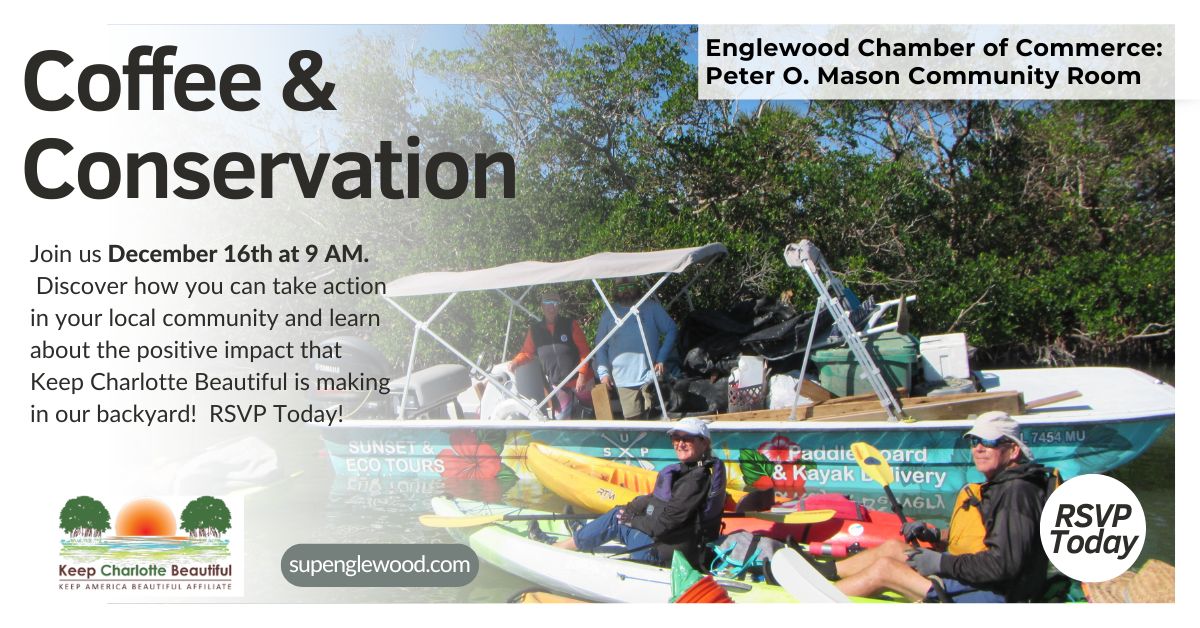 Join SUP Englewood for December’s Coffee & Conservation featuring Rhonda Harvey, Director of Keep Charlotte Beautiful. Learn how KCB is reducing litter, improving recycling, and leading community beautification programs throughout Charlotte County. Complimentary coffee and pastries provided by The Dearborn Coffeehouse & Bakery.