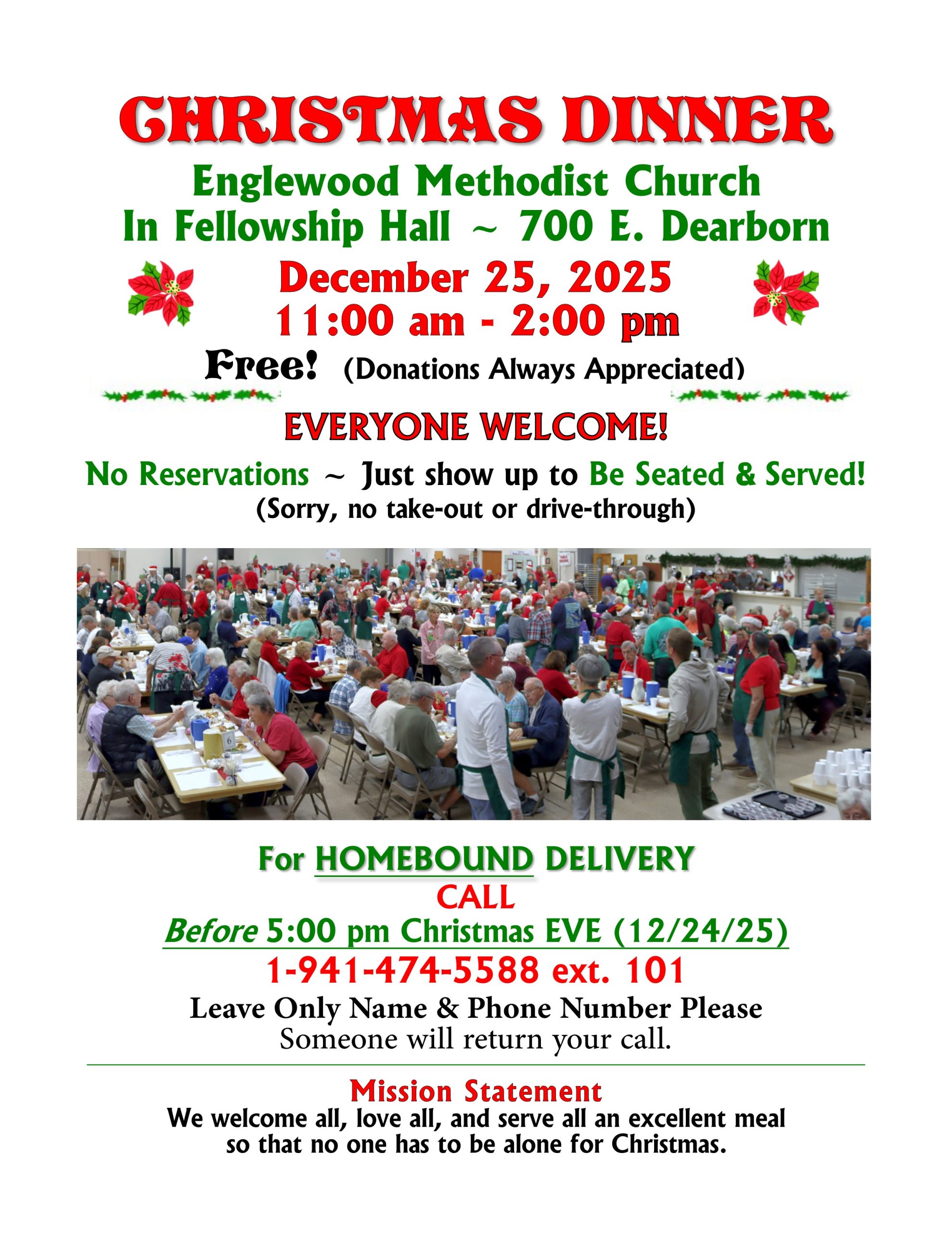 Delivery to homebound folks is available by calling the church office at 941-474-5588 ext. 101 before 5:00 pm on Christmas Eve.