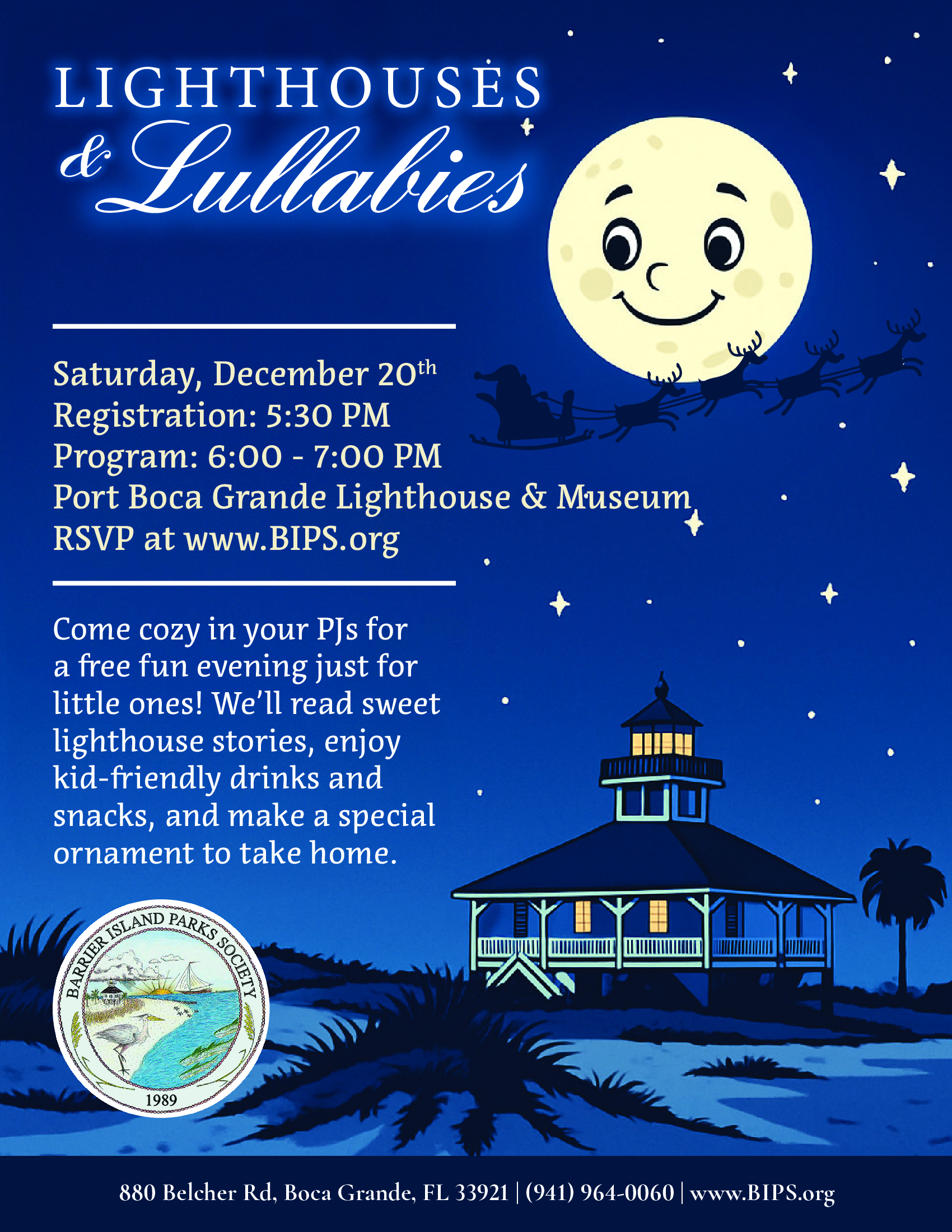 Join us for Lighthouses & Lullabies at the Port Boca Grande Lighthouse & Museum on Saturday, December 20, from 6:00 to 7:00 PM. Families are invited to come cozy in their pajamas for a fun evening designed especially for little ones. The program will feature lighthouse-themed story time, kid-friendly drinks and snacks, and a craft activity where each child can make their own ornament to take home.