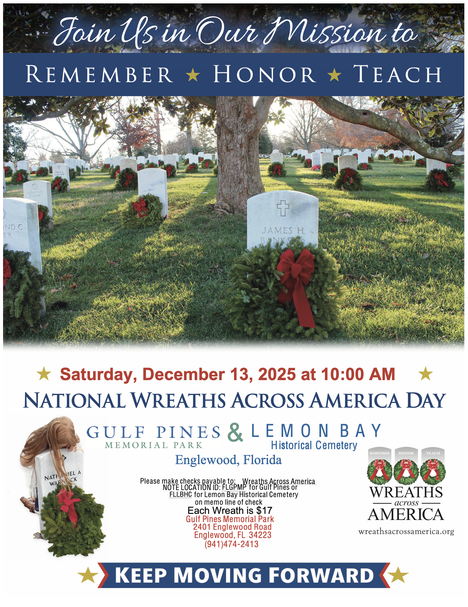 Englewood, FL — On Saturday, December 13, 2025, the Englewood community will come together to honor and remember the nation’s fallen heroes during National Wreaths Across America Day. A special ceremony will take place at Gulf Pines Memorial Park, located at 2401 Englewood Road, beginning at 10:00 AM.