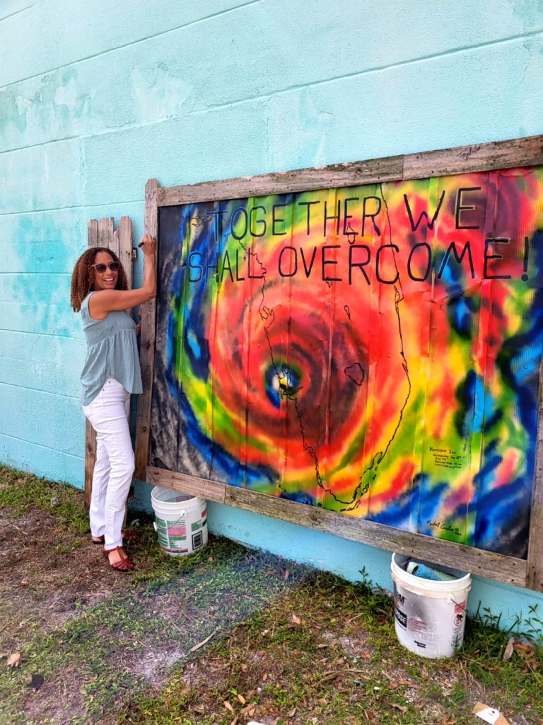 Chances are you’ve seen his work at Pioneer Plaza. That mural on the fence after Hurricane Ian? That’s his. He painted it on the remnants of their shed and fence to raise money for locals. People still come by to sign it. “Together We Shall Overcome.” The colorful mural is part art, part community gathering place.