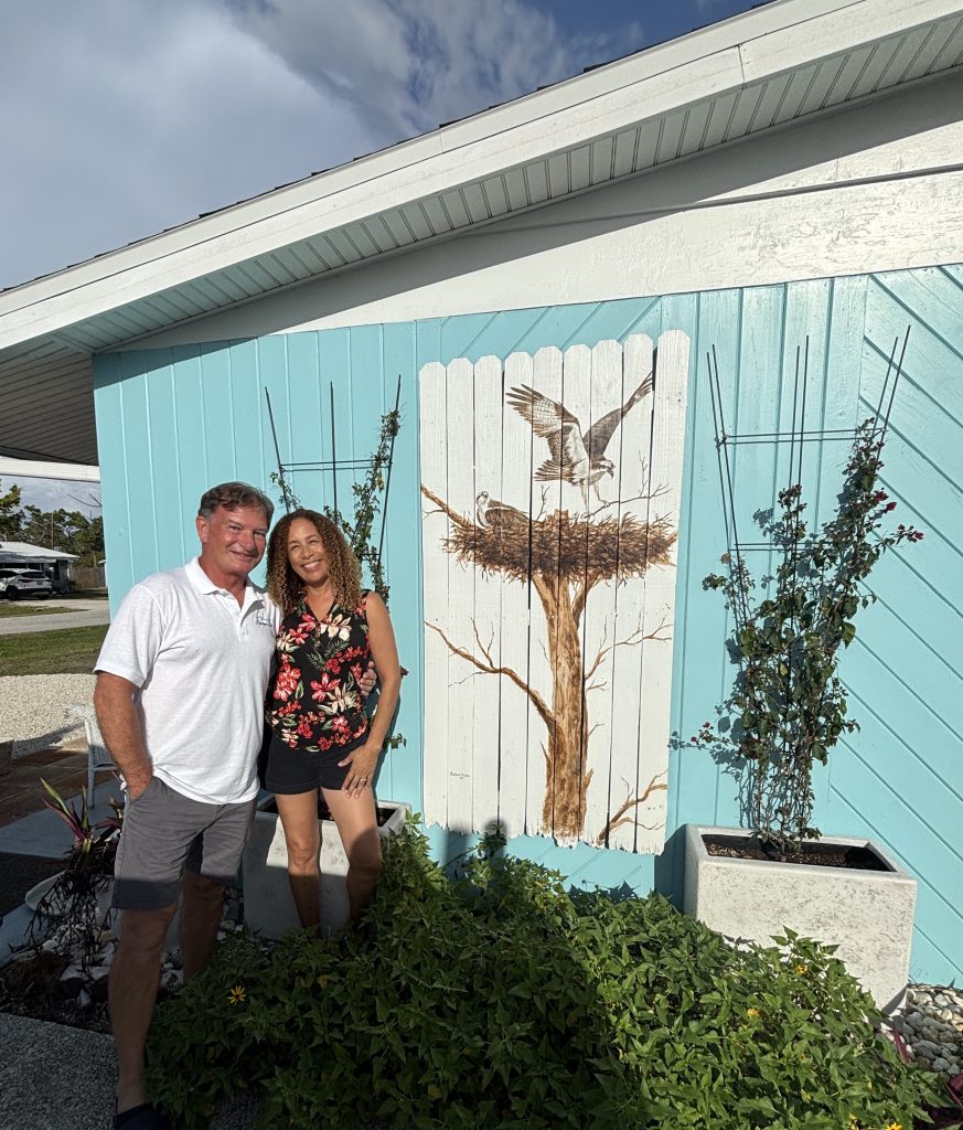 Now, they call their place “The Osprey House.” It’s exactly what you’d imagine from two creatives: murals everywhere, the house lovingly restored after Hurricane Ian. Out back sits Robert’s two-story with a loft art studio. There’s also a hot tub, a sailboat-inspired bar, and a beach-style lounge area that makes you want to stay forever, sipping mojitos or margaritas.