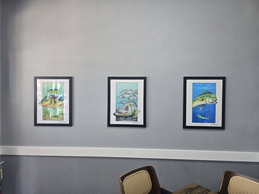 Supporting local art is another big piece of what makes Mako’s unique. Walk in, and you’ll notice the original work of Sebastian decorating the walls. A 13-year-old artist and angler from Sarasota, even the Florida Wildlife Commission has noticed Sebastian’s talent. “We’re proud to show off ‘Sebastian in the Wild.’ Come in, see his work, and support a young artist,” says Mike.