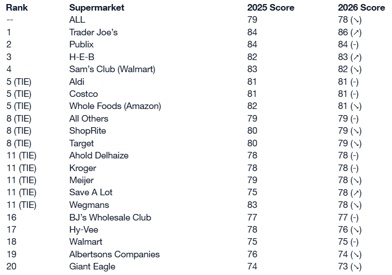 The report looks at how satisfied customers feel across different industries, including supermarkets. This year, satisfaction with supermarkets slipped a bit—it’s down 1% to an ACSI score of 78. Inflation and tough competition are wearing on the industry.