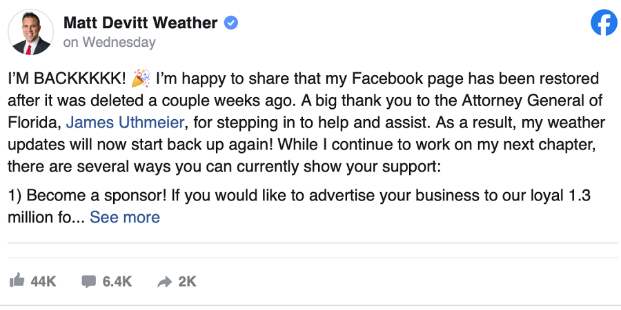 Then, suddenly, he was back. On February 11, Devitt returned to Facebook with a victory post: “I’M BACKKKKK! I’m happy to share that my Facebook page has been restored after it was deleted a couple weeks ago. A big thank you to the Attorney General of Florida, James Uthmeier, for stepping in to help and assist. As a result, my weather updates will now start back up again!” The reaction was immediate and overwhelming. Within half an hour, his announcement racked up more than 1,500 comments and 14,000 reactions. Clearly, he hadn’t lost his audience.