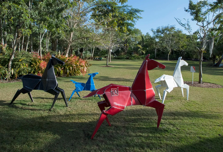 Artists Jennifer and Kevin Box started everything with a single, uncut square of paper. They carefully folded each model, then transformed it into bronze, steel, or aluminum, creating thirteen monumental outdoor sculptures and an “Inside Out” indoor gallery. As visitors wander across 27 acres of waterfront sanctuary, they stumble upon cranes rising as symbols of peace, ponies galloping in frozen motion, butterflies suspended mid-flight, and koi or blossoms floating among mangroves and marshes.
