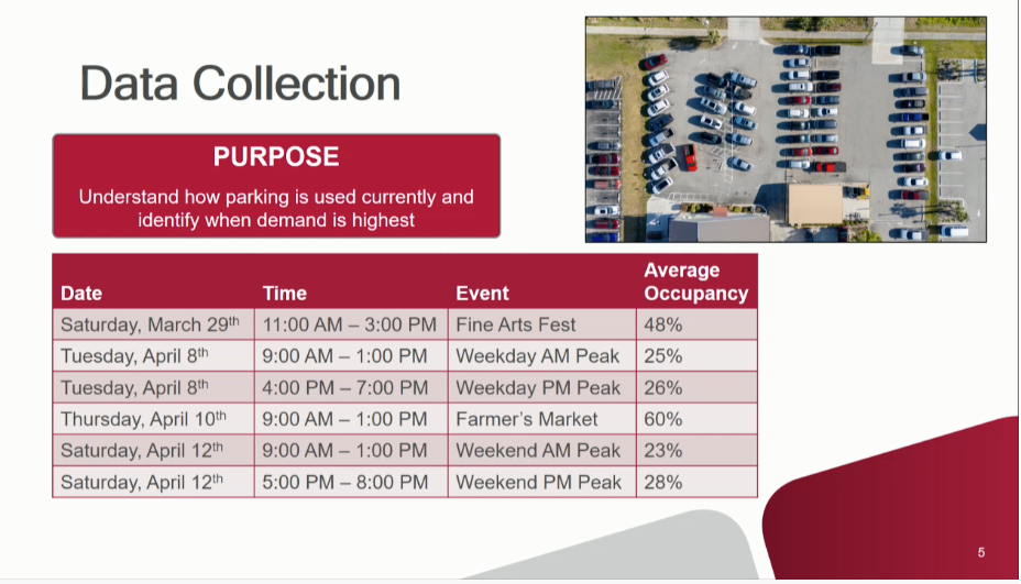“The highest demand we observed was during the farmers market, when about 60 percent of all spaces in the study area were occupied,” Davis said. He noted that during the Fine Arts Festival, about 74 percent of public parking spaces were occupied between 11 a.m. and noon.