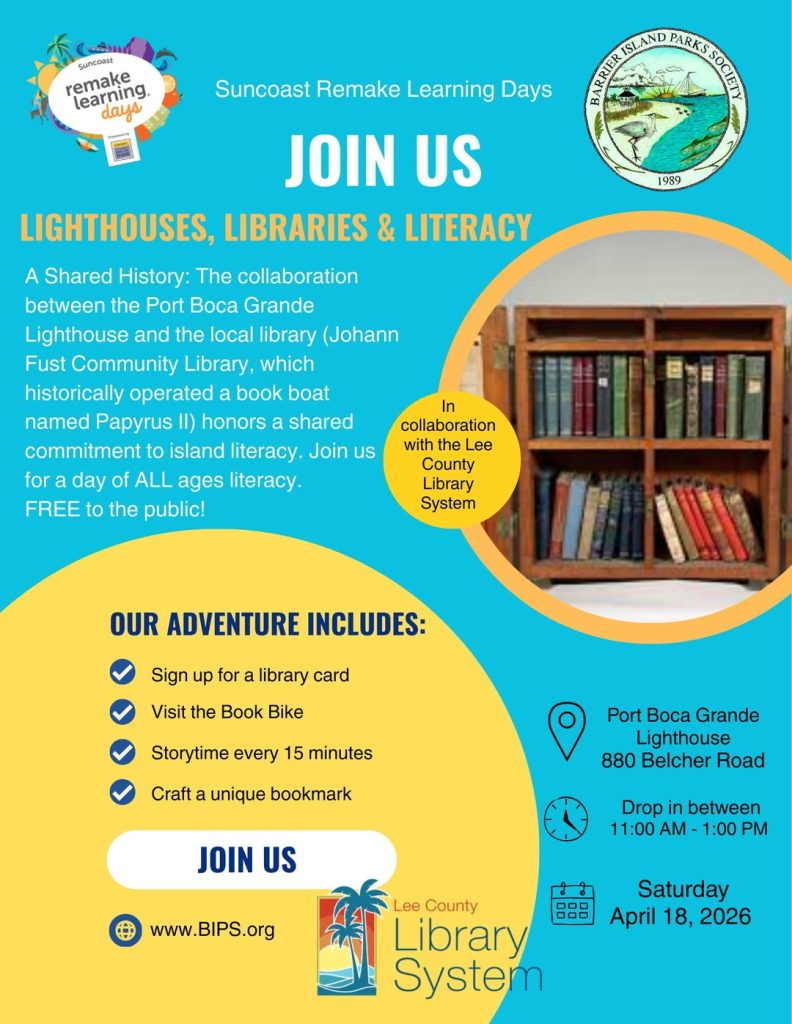 “Lighthouses, Libraries & Literacy” brings together local gems and community partners. You’ll catch the Lee County Library System and the Johann Fust Library Foundation working together with the lighthouse to showcase the rich coastal history and spark young readers’ imaginations.