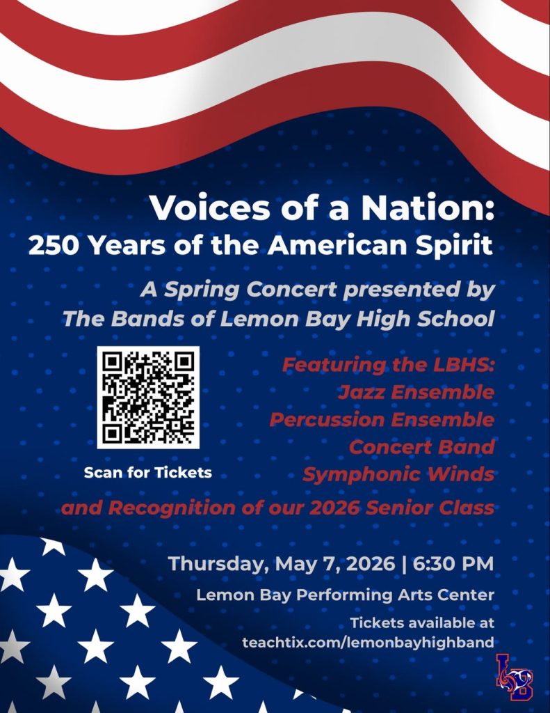 Get your tickets at teachtix.com/lemonbayhighband/spring-band-concert. Admission is free, but donations are always appreciated.